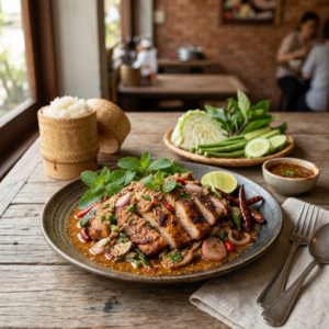 น้ำตกไก่ย่างเป็นหนึ่งในเมนูอาหารอีสานที่ได้รับความนิยมอย่างแพร่หลาย ด้วยรสชาติที่จัดจ้านและกลิ่นหอมของเครื่องเทศ โดยเฉพาะเมื่อนำไก่ไปย่างจนกรอบนอกนุ่มใน และราดด้วยน้ำจิ้มที่มีส่วนผสมของน้ำมะนาว พริกป่น และข้าวคั่ว ทำให้เป็นเมนูที่ไม่ควรพลาดสำหรับคนรักอาหารไทยที่ต้องการสัมผัสรสชาติที่แปลกใหม่